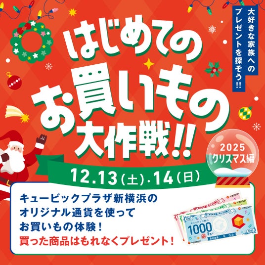 お子さまにクリスマスの「お買いもの」を体験してもらう特別なイベント!サンタに仮装して、オリジナル通貨(7,000キュー)を自由に使い、対象ショップの好きな商品を選べます。お買い上げいただいた商品はもれなくプレゼント!
