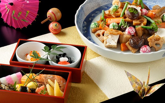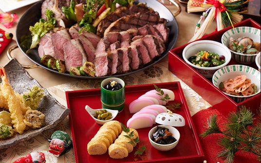- 目玉: 黒豆、伊達巻、かまぼこなどの縁起料理をはじめ、煮物や小鉢料理など、新年の幕開けにふさわしい祝い膳の趣を添えた和のメニューが並びます。