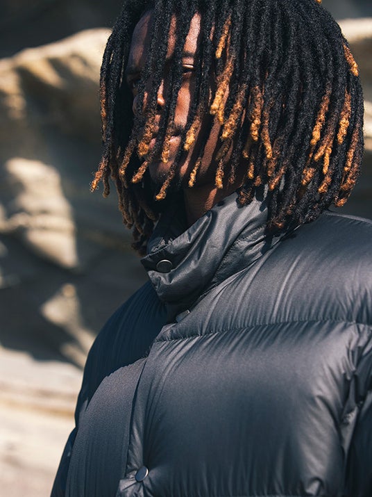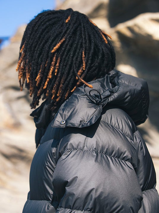 - シルエット: 適度なゆとりとダウンらしいボリューム感を持つルーズなシルエット。裾やフードにドローコードが付いており、シルエットの調整が可能。