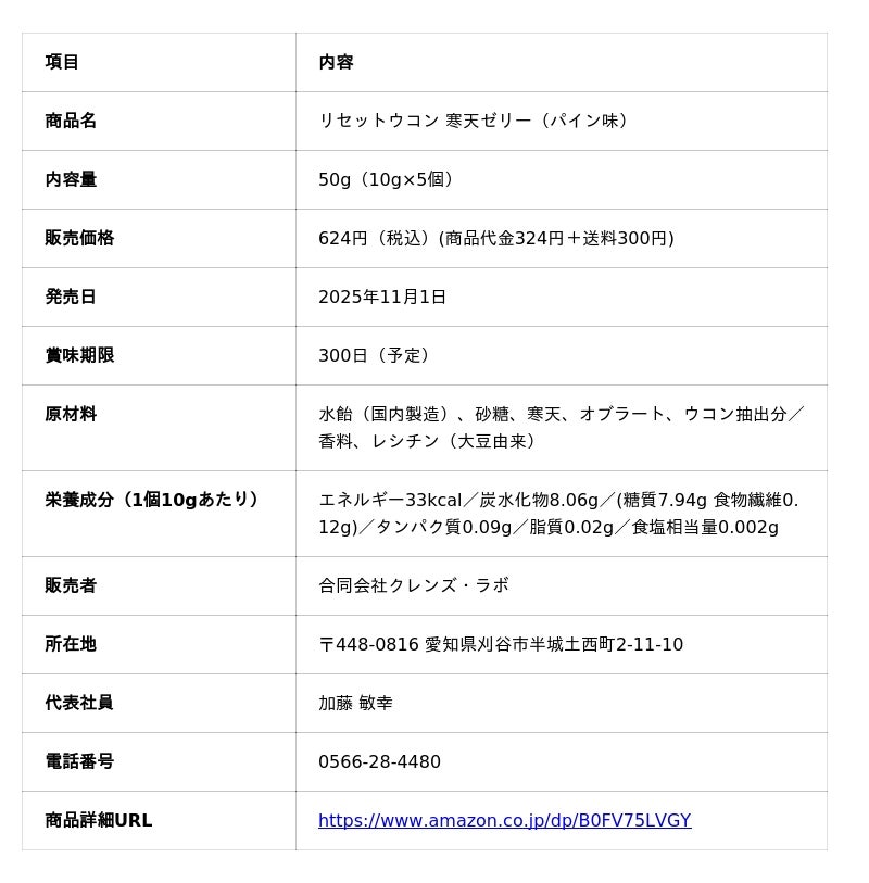 合同会社クレンズ・ラボは、二日酔い対策の常識をひっくり返す「リセットウコン 寒天ゼリー(パイン味)」を2025年11月より発売します。パインの甘酸っぱいゼリーで、おいしく楽しく翌朝を軽やかにリセットする新習慣を提案します。