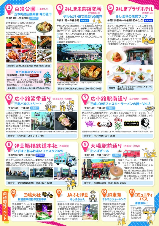 今年は新たに「みしま未来研究所」を加え、全9会場を舞台に、地元飲食店、生産者、市民が一丸となって一日限りの食の祭典を盛り上げます。