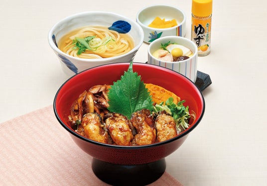 人気の釜めし御膳に牡蠣が登場。牡蠣の旨みが染み込んだ釜めしは、香ばしい風味とふっくらした食感が魅力です。牡蠣の天ぷら(またはカキフライ)と手延べうどんがセットです。