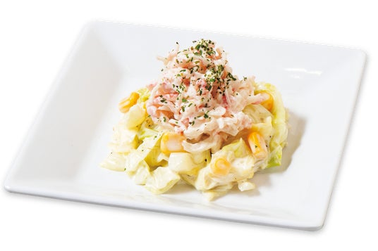 キャベツとカニ風味サラダのコールスローかにの旨みを活かした、マヨネーズ仕立てのコールスロー。まろやかな味わいで焼肉の前菜にもぴったり。