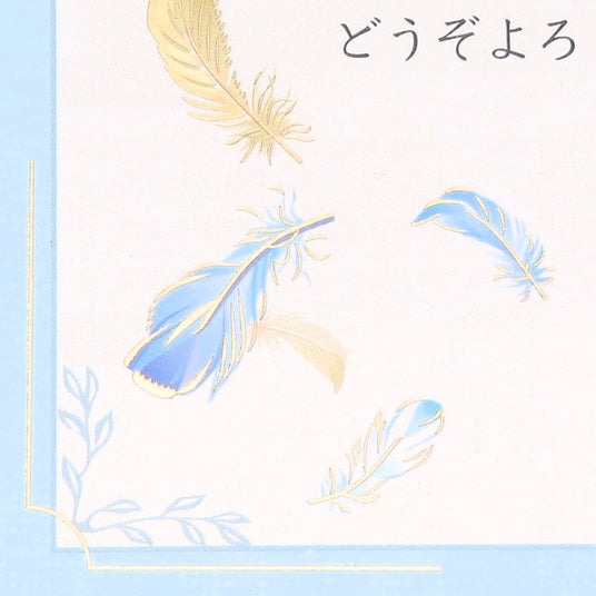 軽やかな羽根柄が上品な印象を与えるデザイン。落ち着いたブルー基調なのでお相手を問わず使いやすく、ビジネスシーンにもぴったり。さりげなく施された金箔加工が品格を添えます。