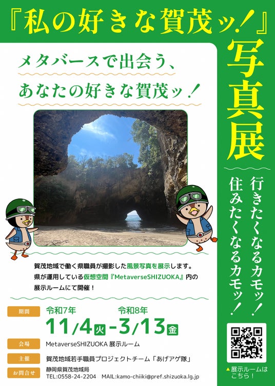 静岡県賀茂地域(下田市、東伊豆町など伊豆半島南部6市町)に勤務する若手県職員のプロジェクトチーム**『あげアゲ隊』が主催となり、地域の魅力を発信する写真展『私の好きな賀茂ッ!』を、仮想空間「MetaverseSHIZUOKA」**内で開催中です!