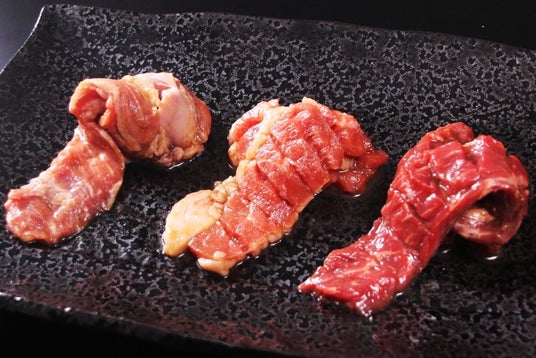 三種一本盛り1,180円(税込1,298円)3種の肉で大満足!牛ハラミ、豚ハラミ、牛カルビを香ばしいタレで焼き上げるガッツリ派におすすめの一皿です。