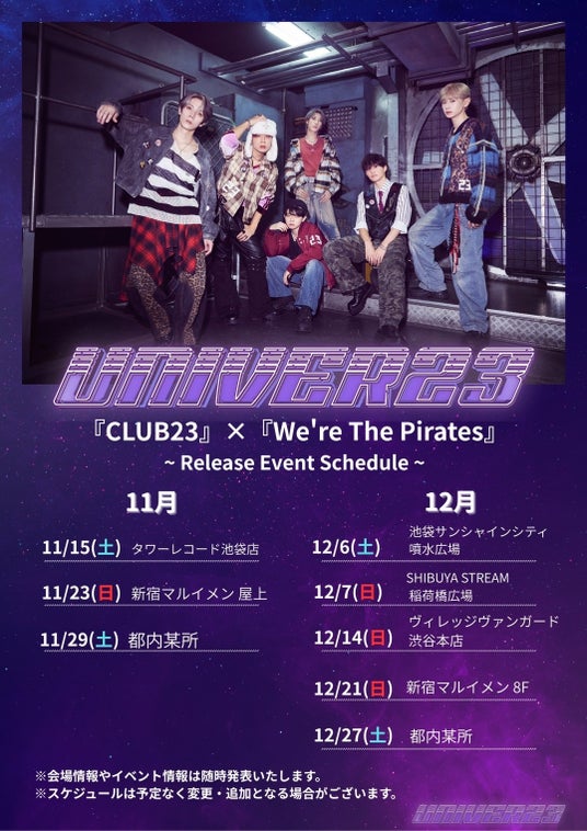 "23区から世界へ"をコンセプトに掲げるボーイズグループ**「UNIVER23(ユニバース)」が、1st One Man Liveで会場のボルテージを最高潮に高めた人気曲「CLUB23」「We're The Pirates」**を収録したダウンロードカードのリリースを発表しました。