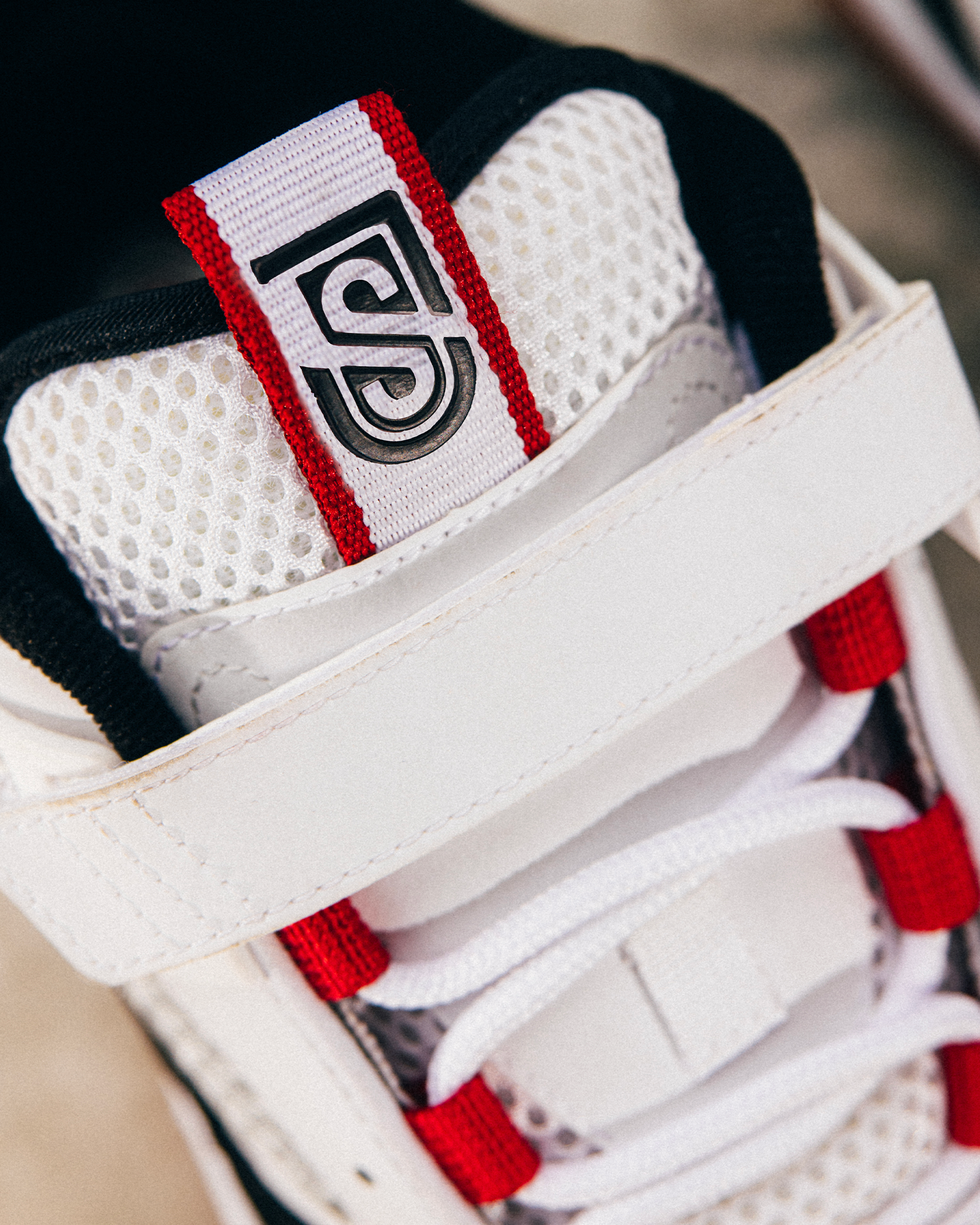 ベースとなるBlack × Whiteのカラーリングに、タン裏、ウェビング、ロゴにはクールな**Royal Red(ロイヤル・レッド)**をアクセントとして配置。John Shanahanならではのストリート感あふれる、洗練されたデザインに仕上がっています。