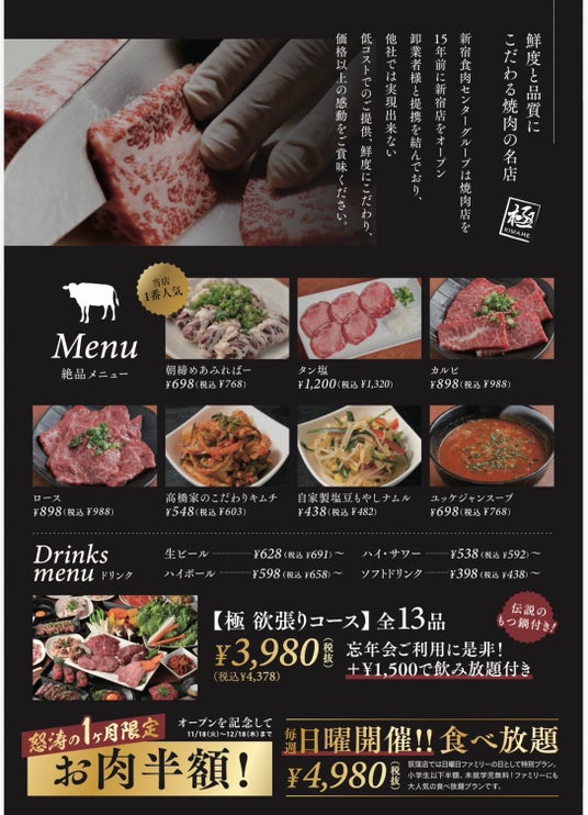 新規オープンを記念して、なんと1ヶ月間、対象のお肉が半額になるキャンペーンを実施。お得に新鮮で高品質な焼肉を堪能できるチャンスです。