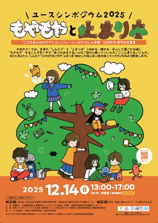若者が抱える“しんどさ”や“もやもや”に社会全体で向き合い、安心して過ごせる“止まり木”(休める・頼れる場)を見つけることを目的とした**「ユースシンポジウム 2025 もやもやと“止まり木”」**が、京都市ユースサービス協会と京都市の共催により開催されます。