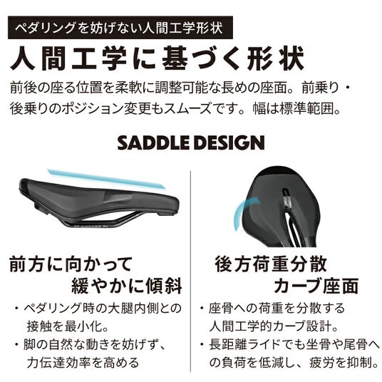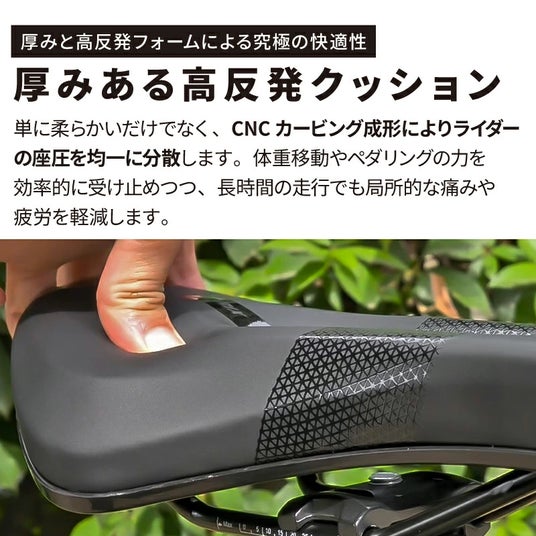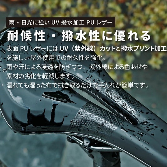 新商品のサドルは、高反発ポリウレタンフォームを使用したクッション性、UV高光沢プリント加工による撥水仕様などが特徴で、快適なサイクリングをサポートします。