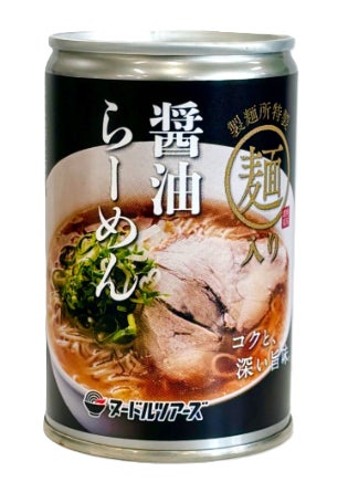 | らーめん缶「醤油らーめん」 | 麺、醤油スープ、具材(ネギ・メンマ・チャーシュー)入り。調理不要、湯煎可能。 |