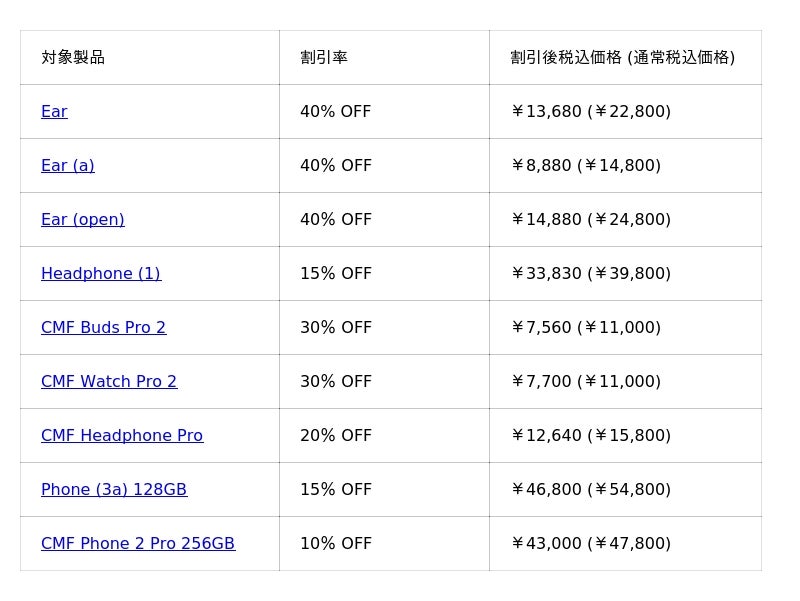 - 対象商品: Nothing史上最多ラインナップ(最大40%OFF)