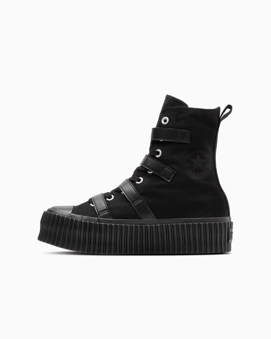 厚底ソールと大胆なベルトデザインが目を引く、ブラックブーツモチーフのモデルです。