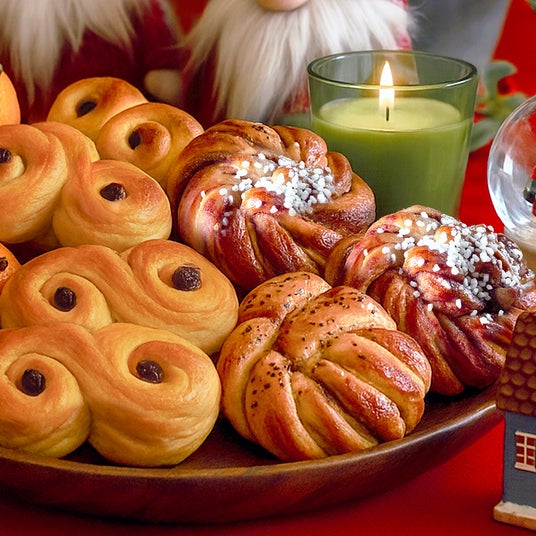 クリスマス時期にスウェーデンで作られる「ルッセカット」は猫の尻尾を丸めたようなS字形に、レーズンを乗せた特徴的なシルエットのパン。サフラン入りの生地は甘く上品な香りが漂い、コーヒーやホットワインとの相性抜群です。ほかにもカルダモンスパイスを練り込んだパンや、北欧定番のシナモンロールも販売します。