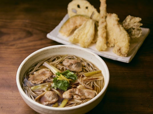 天ぷらと相性抜群の蕎麦メニューも登場。肉厚でやわらかい鴨ロース肉を使用し、じっくり火を入れることで、脂の甘みが溶け出した特製出汁が完成しています。