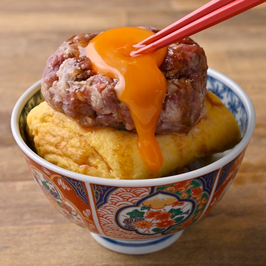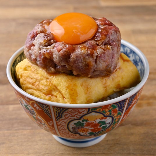 - 「生で食べられる¨馬映¨バーグ丼」 1,628円(税込):生肉好き必食!極上の生ハンバーグに自家製出汁巻とべっこう玉をトッピング。