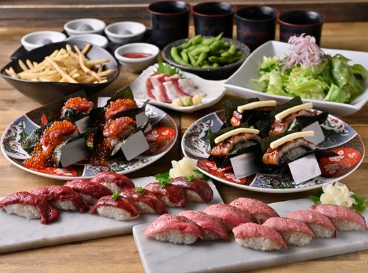 さらに、肉寿司ならではのお酒のあてにぴったりなおつまみメニューと豪華飲み放題も思う存分お楽しみいただけます。