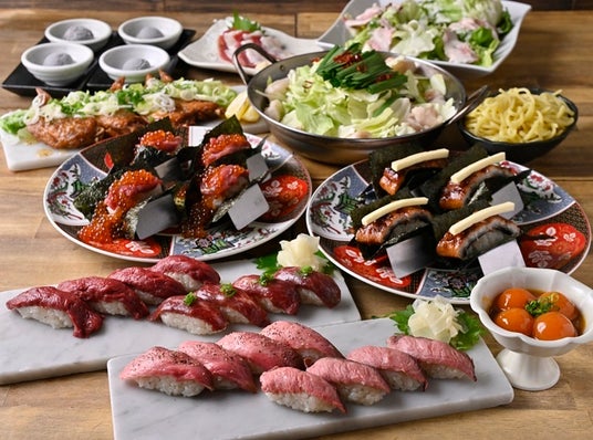 名物の「肉寿司」をはじめ、旨みたっぷりの「国産もつ鍋」や話題の映える進化系寿司「寿司ドッグ」、さらに〆とデザートまで付いて大満足間違いなし!