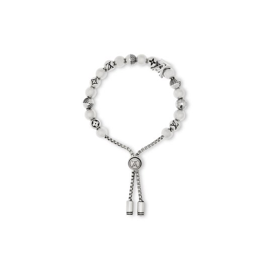 シルバーカラーのメタルを使用した、フレッシュでダイナミックな「ブレスレット・ダミエ ステープル ボール」。チェック・モチーフとメゾンのシグネチャーを組み合わせて光沢感のある球状のビーズ1つ1つに精緻に刻印し、目に留まる魅力的なアイテムに仕上げました。お好みのフィット感に調節可能なチェーンにより、1日中快適に着用できます。