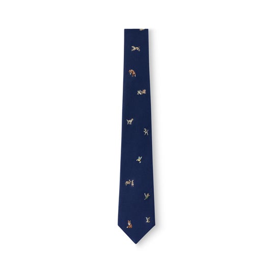 シルク100%の素材を使用した「ネクタイ・アニマル ブラゾン」。ラグジュアリーに遊び心をさりげなく添えた、イタリア製のアイテムです。洗練されたネイビーのジャカード生地を小動物のモチーフで彩り、ホワイト&ゴールドカラーのLV イニシャルをあしらいました。動物好きの方にはもちろん、メゾンの愛好家にもぴったりのユニークなアイテム。