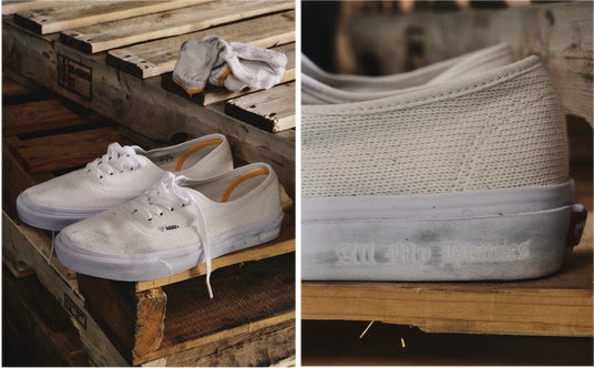 Authenticは、アッパーに厚手の白いキャンバス素材と、アグレットとシューズ内部に黄色のアクセントを加えることで、一般的な綿素材の軍手を表現しました。ソール部分に同色で施された「All My Homies」のロゴが、シンプルながらも洗練された存在感を与えています。