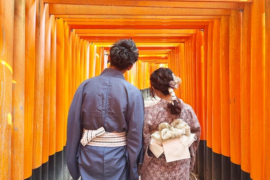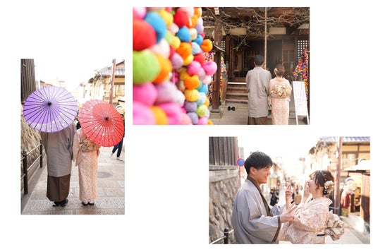 小紋、振袖、訪問着、男女の袴など、観光向けの幅広いラインナップのすべてが選択可能です。二人の個性やテーマ、場所に合わせて、理想の和装コーディネートを自由に楽しめます。