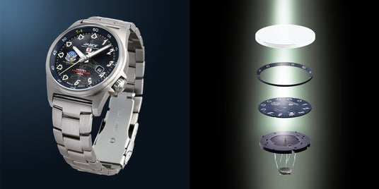 • 蓄光: インデックスと針には強蓄光を塗布。秒針と6機のアローインデックスは、記念モデル限定のブルーに発光する特別仕様です。