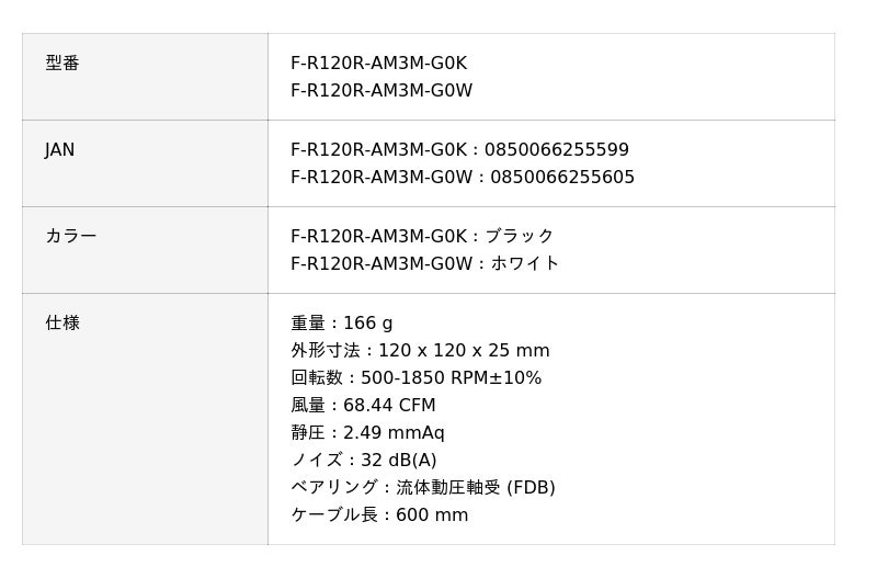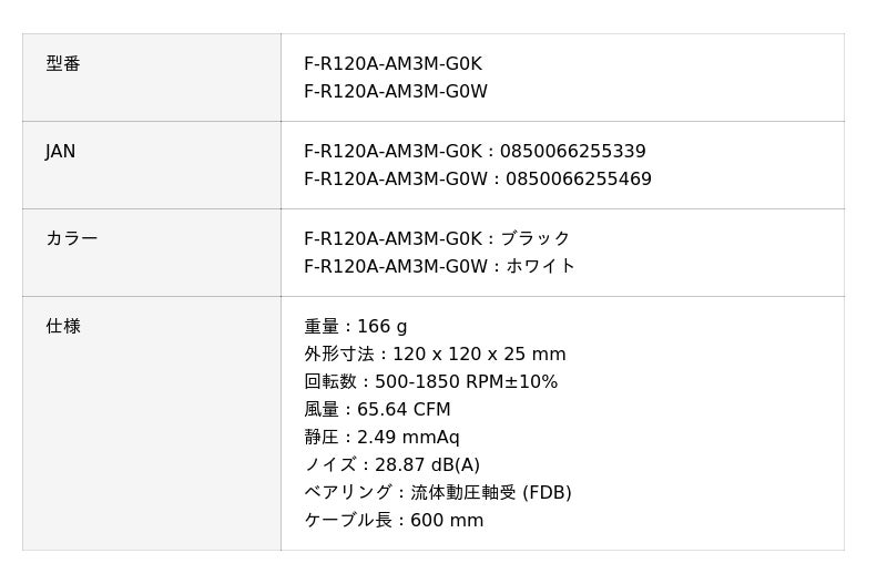 - 静音性: 静音性と製品寿命の長い**流体動圧軸受(FDB)**ファンを採用。