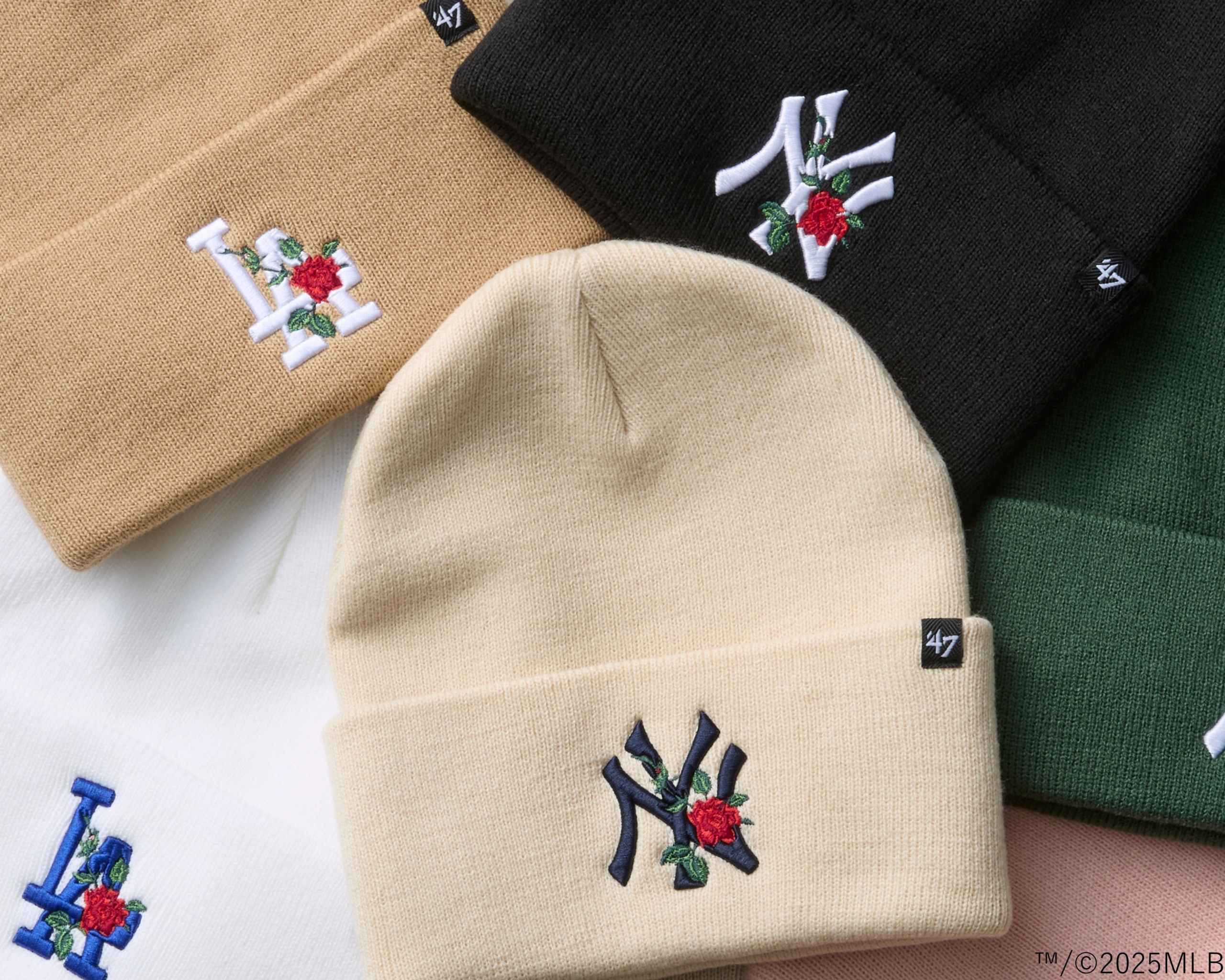 1947年に米国ボストンでスタートしたカジュアルライフスタイルブランドである’47(フォーティーセブン)は、ニューヨーク・ヤンキースとロサンゼルス・ドジャースのMLB球団ロゴにバラの花を組み合わせた、遊び心のあるデザインを取り入れたニットキャップを、公式オンラインストア、'47長野をはじめ全国の’47取扱店舗にて発売いたしました。