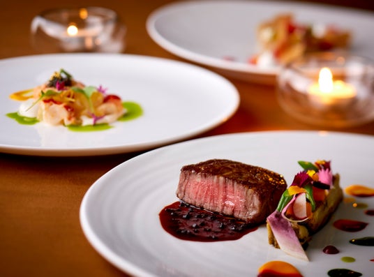 ディナーコースでは、ヨーロピアンオマール海老やフォアグラ、九州産黒毛和牛フィレ肉など、厳選食材を贅沢に使用。アミューズからデザートまで美しく構成されたフルコースは、素材の持ち味とクラシックな技法が織りなす渾身の仕上がりです。