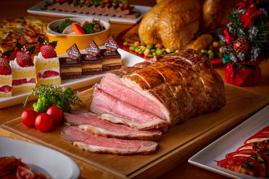 ビュッフェ台には、ローストチキンやラザニアなどクリスマスを象徴する華やかなメニューがずらりと並びます。ライブキッチンでは、ジューシーに焼き上げた ビーフステーキ やできたてを味わえるパスタ、ピザをご提供。シェフが目の前で仕上げる香りや熱気とともに、ホテルならではの贅沢なひとときをお楽しみいただけます。