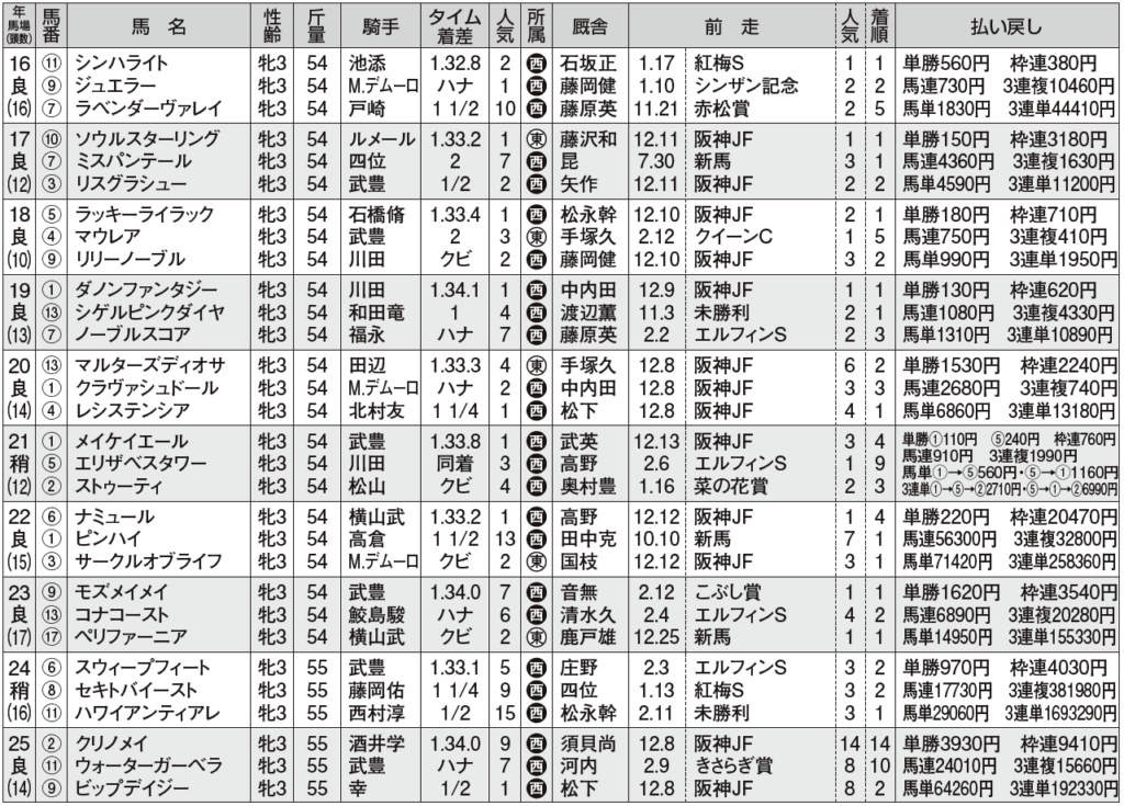 [2・1・1・12]のエルフィンS組、[1・1・0・9]の紅梅S組にも目が行くが、複勝率は阪神JF組の半分以下と苦戦している。