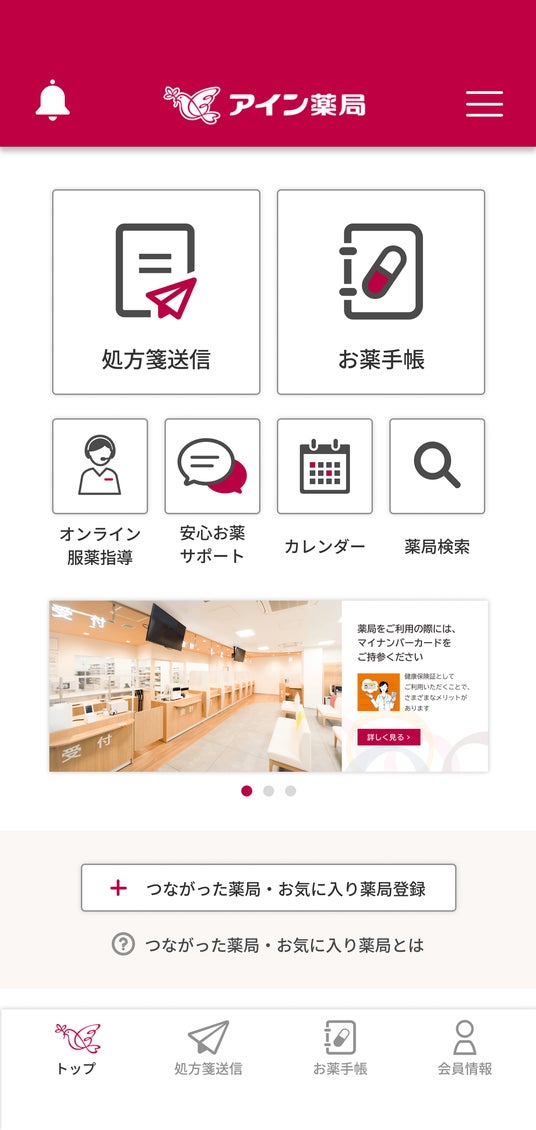 アイン薬局への処方箋送信からオンライン服薬指導、薬の相談・管理までアプリひとつでご利用いただけます。