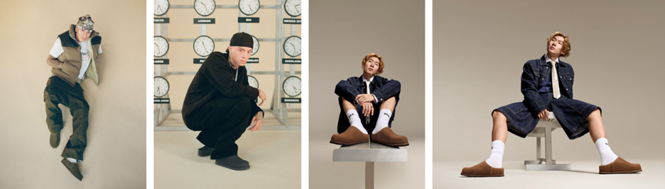 このアイコンのグローバルな進化と再創造が、今季キャンペーンのインスピレーションとなりました。Central Cee は、世界主要都市の時刻を示す時計が並ぶ壁を背景に登場し、UGGのタイムレスなスタイルが世界中で息づいていることを表現。一方、Su Yimingはミニマルな空間でストリートスタイルに身を包み、新作フットウエアの存在感を際立たせています。