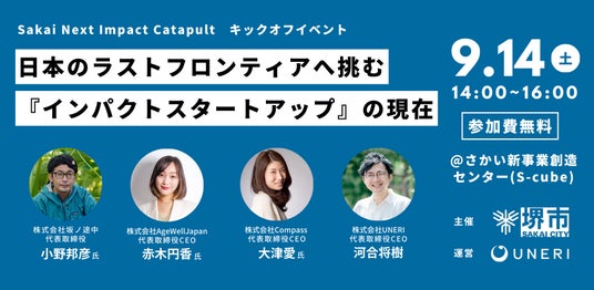 スタートアップ支援事業を展開する「株式会社UNERI」(本社:愛知県名古屋市 代表取締役:河合将樹)は、堺市が運営する「社会課題解決型事業の創出と経済的な成長を両立し、前向きな影響を社会にもたらす起業家」を生み出すことを目的としたプログラム「Sakai Next Impact Catapult(以下SNIC) 」の運営事務局を務めます。合わせて、キックオフイベントを2024年9月14日(土)に実施いたします。