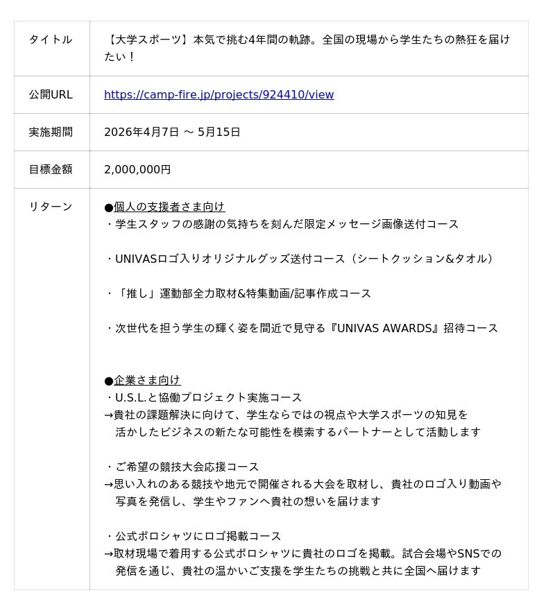一般社団法人大学スポーツ協会(所在地:東京都千代田区、会長:福原紀彦、以下 UNIVAS)における学生組織『UNIVAS STUDENT LOUNGE (U.S.L.)』は、学生アスリートやスタッフの魅力をより広く社会へ届けるため、取材遠征費の確保を目的としたクラウドファンディングに現在挑戦しております。