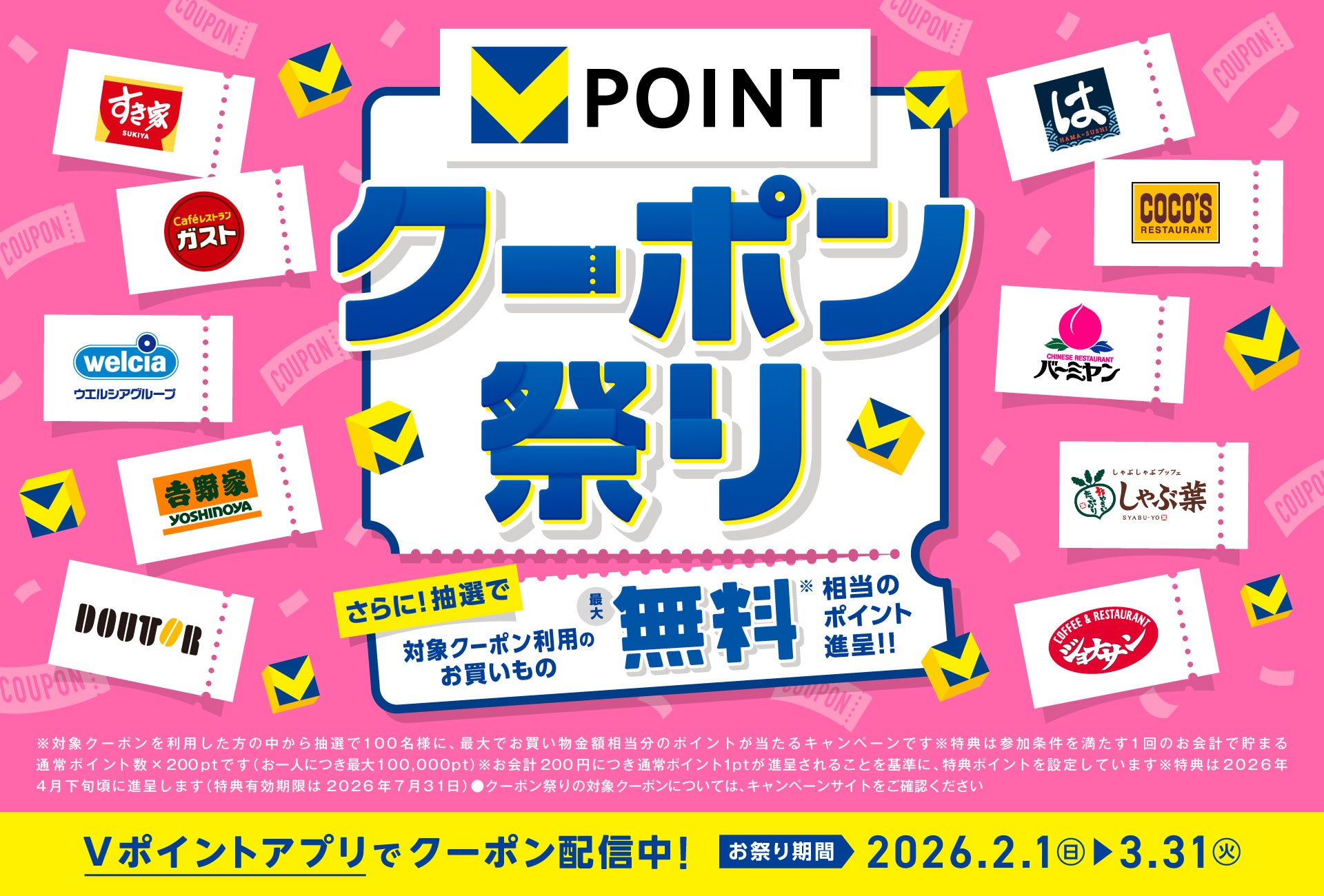 CCCMKホールディングス株式会社(本社:神奈川県横浜市、代表取締役社長兼CEO:高橋 誉則、以下「CCCMKHD」)は、2026年2月1日(日)から3月31日(火)まで、Vポイントがお得に貯まる「クーポン祭り」(https://vpoint.net/vc2)を開催します。モバイルVカード対応店舗全店で使える「毎週配信!1週間ずっと2倍クーポン」や、さまざまなVポイント提携先の利用でVポイントがもらえるクーポンなど、通常よりもお得にお買い物やお食事を楽しめるキャンペーンです。さらに抽選で、最大でお買い物金額相当分のVポイントが当たる「お買い物最大無料キャンペーン」も実施します。