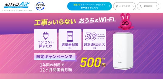 モバレコAirは、株式会社グッド・ラックが提供する工事不要のホームルーターで、コンセントに挿すだけで手軽にインターネットを利用することができます。