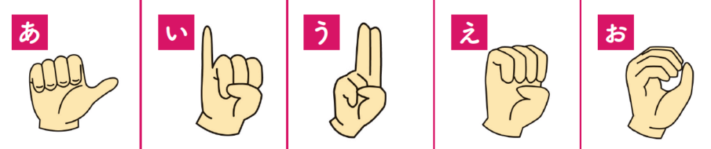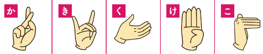 「む」は親指と人差し指でL字をつくる。数字の「6」(”むっつ”から)。