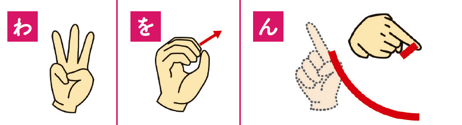 「わ」は手のひらを相手に見せ、人差し指、中指、薬指を立てる。「W」と同じ手話。