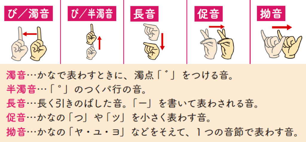 「長音」は人差し指を伸ばし、上から下に下ろす。タクシーの「ー」のように伸ばす部分の表現の仕方。