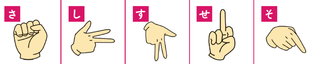 「さ」はグーの形。親指は外に出す。「s」と同じ手話。