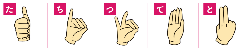 「た」は親指を立て、握りこぶしをつくる。親指の腹を相手に見せるように。
