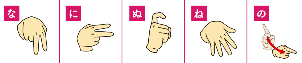 「な」は人差し指と中指を下に向ける。「n」も表す。