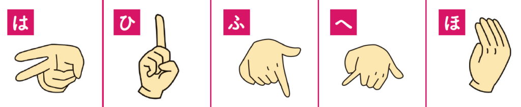 「は」は人差し指と中指を前方斜め下に出す。「h」と同じ手話。はさみの「は」。