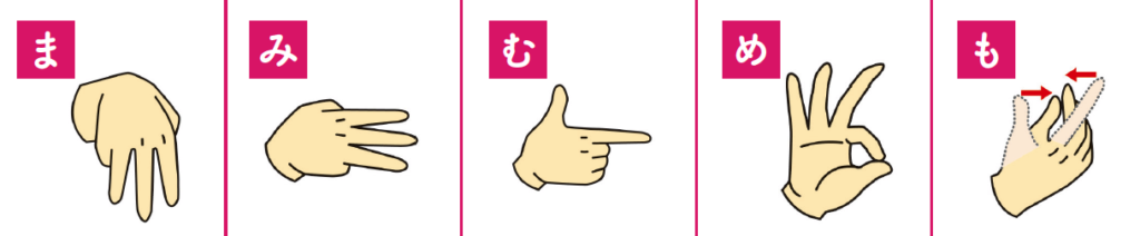 「ま」は人差し指、中指、薬指を開いて伸ばし下に向ける。「m」もあらわす。
