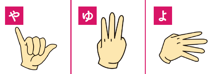 「や」は小指と親指を立て、他の指は握る。「Y」と同じ手話。