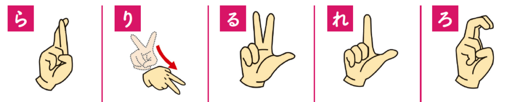 「ら」は人差し指に中指をからませる。「r」と同じ手話。
