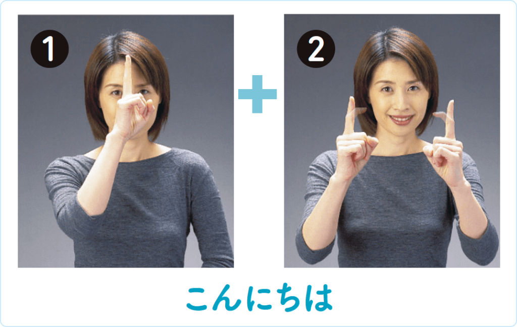 右手の人差し指と中指を立て、顔の前に置く(時計の12時の位置)。「昼」「正午」の意味。両手の人差し指を立てて向かい合わせ、人差し指を折り曲げる。「あいさつ」の手話。